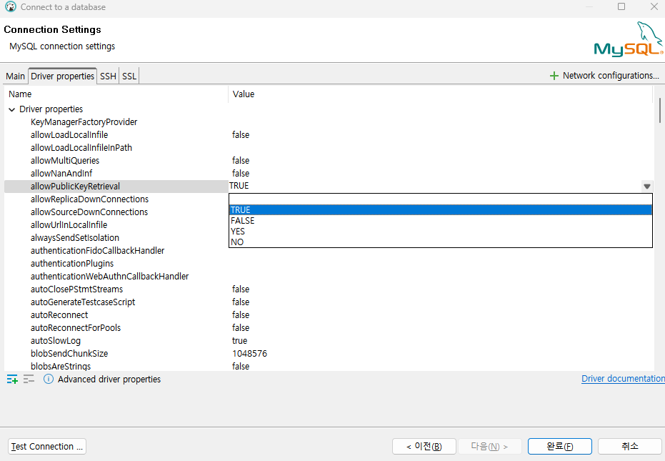 4. 커넥션 세팅 창에서 Driver properties로 가서 해당 옵션을 True로 바꿔주고, 다시 Main으로 와서 연결해주면 해결!