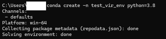 본인은 test_vir_env라는 이름의 가상환경을 python 3.8버전으로 설치하고자 한다.