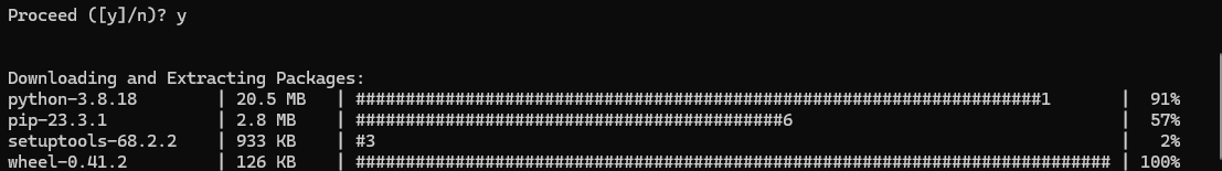 을 입력해보자. 이러쿵저러쿵 저절로 가상환경 생성 절차가 진행되고, 마지막에는 진짜 설치할 것인지를 묻는다.